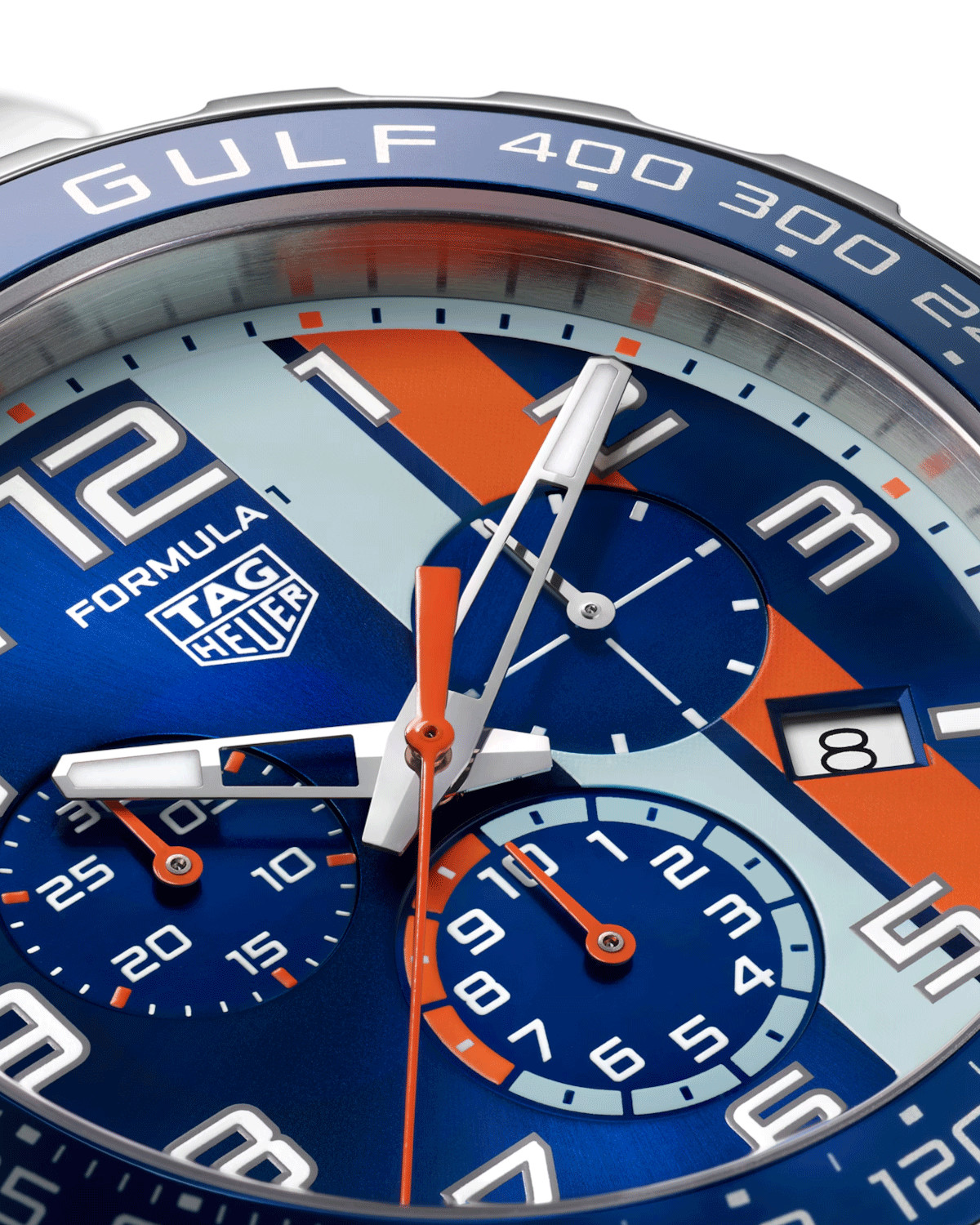 A striking blue and orange dial, a real nod to the Gulf stable.