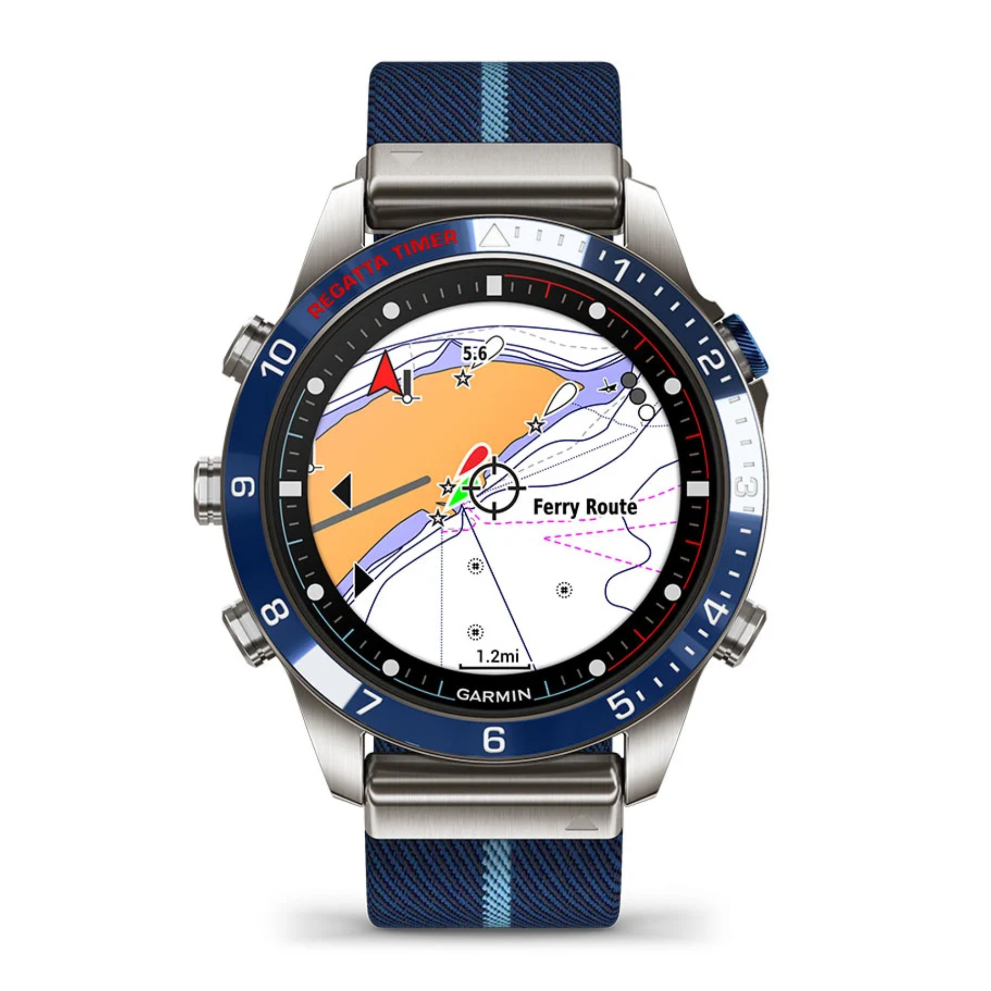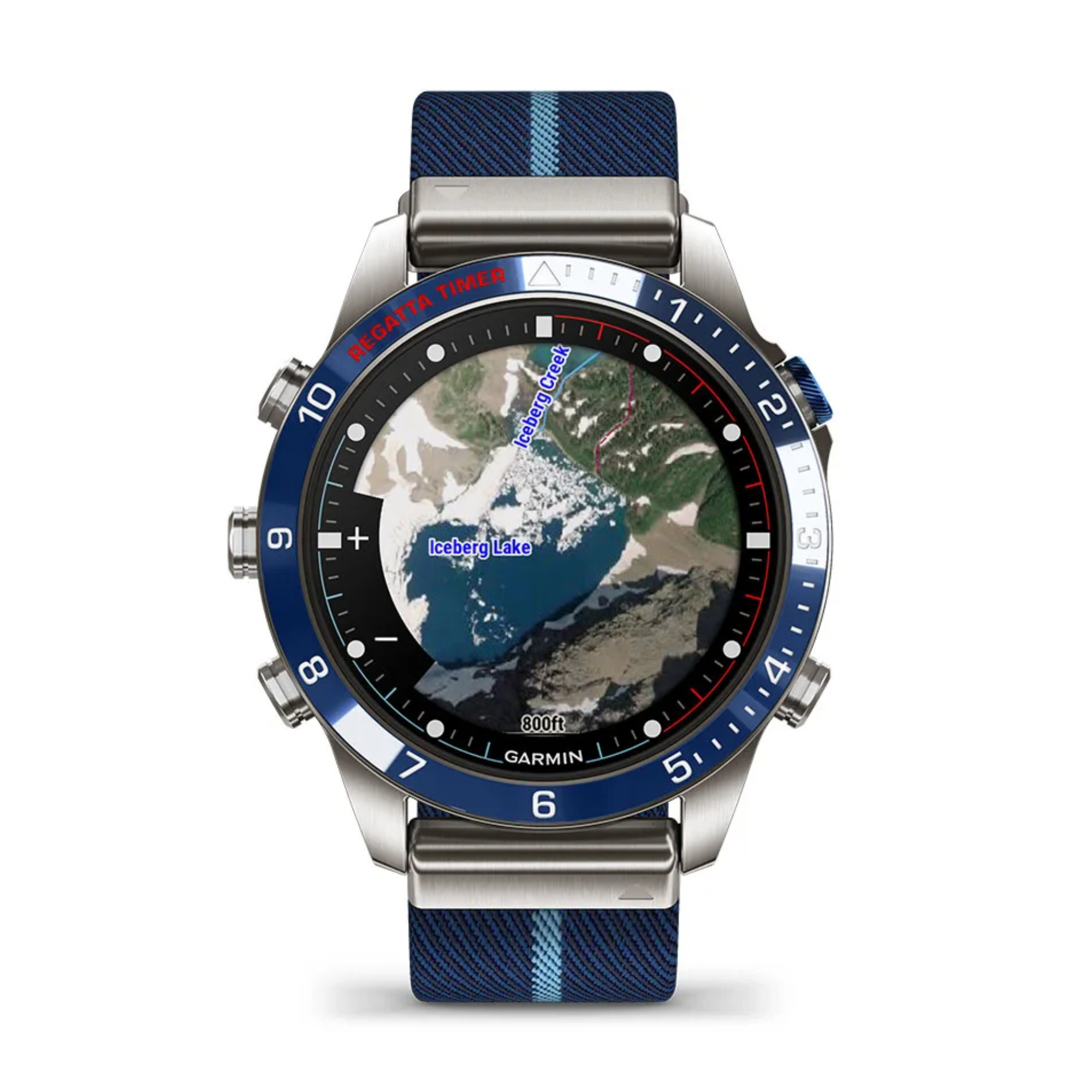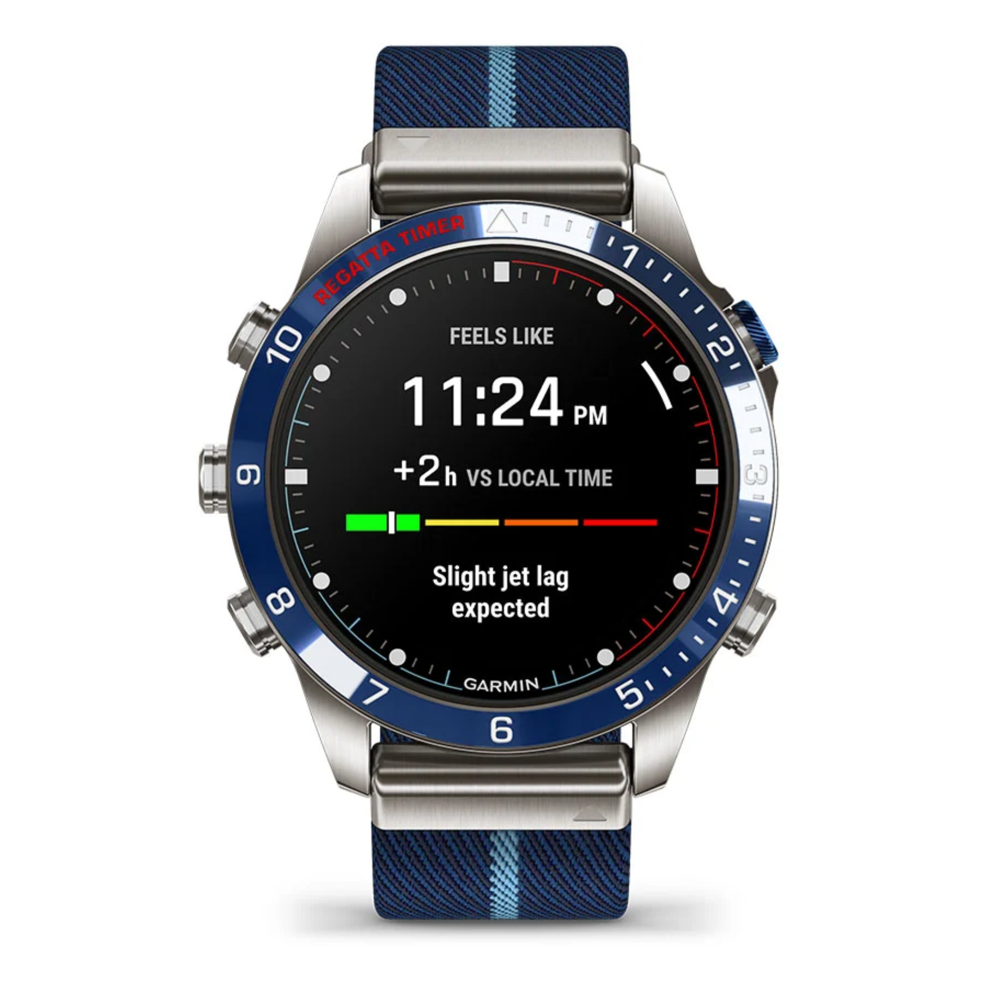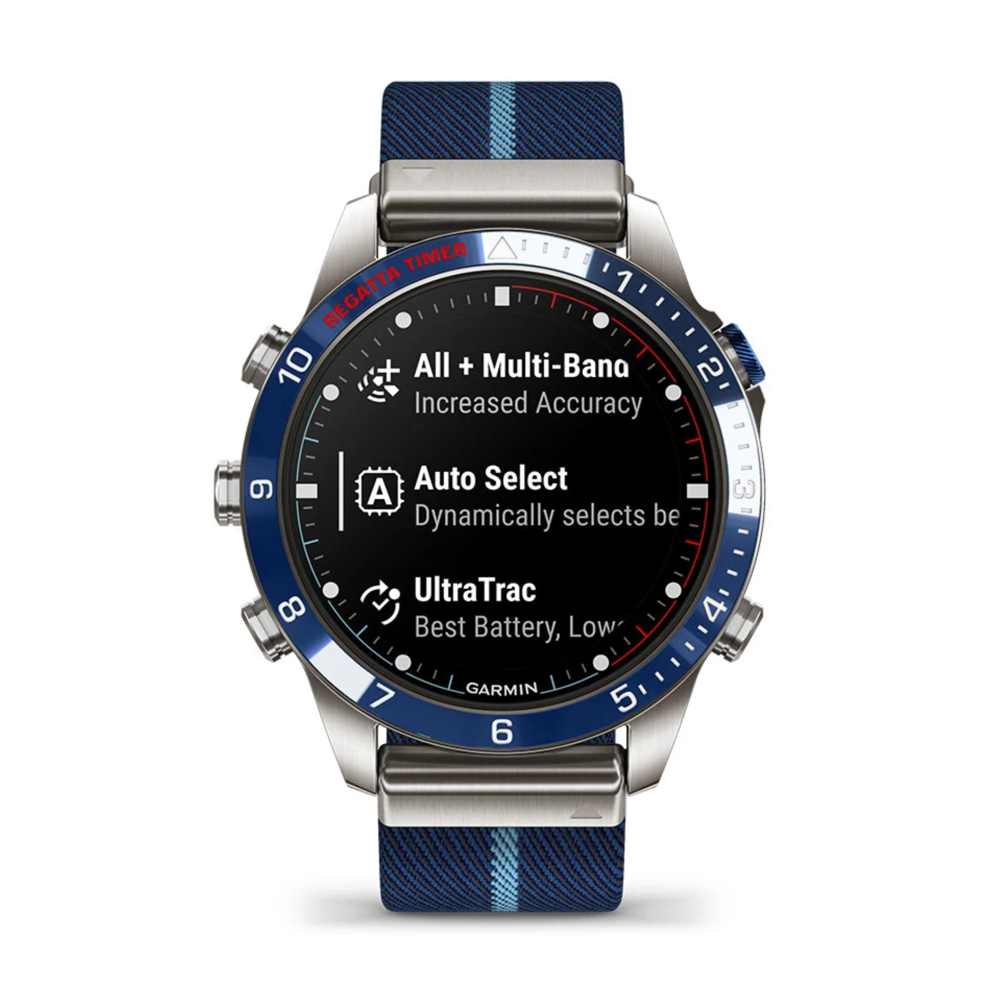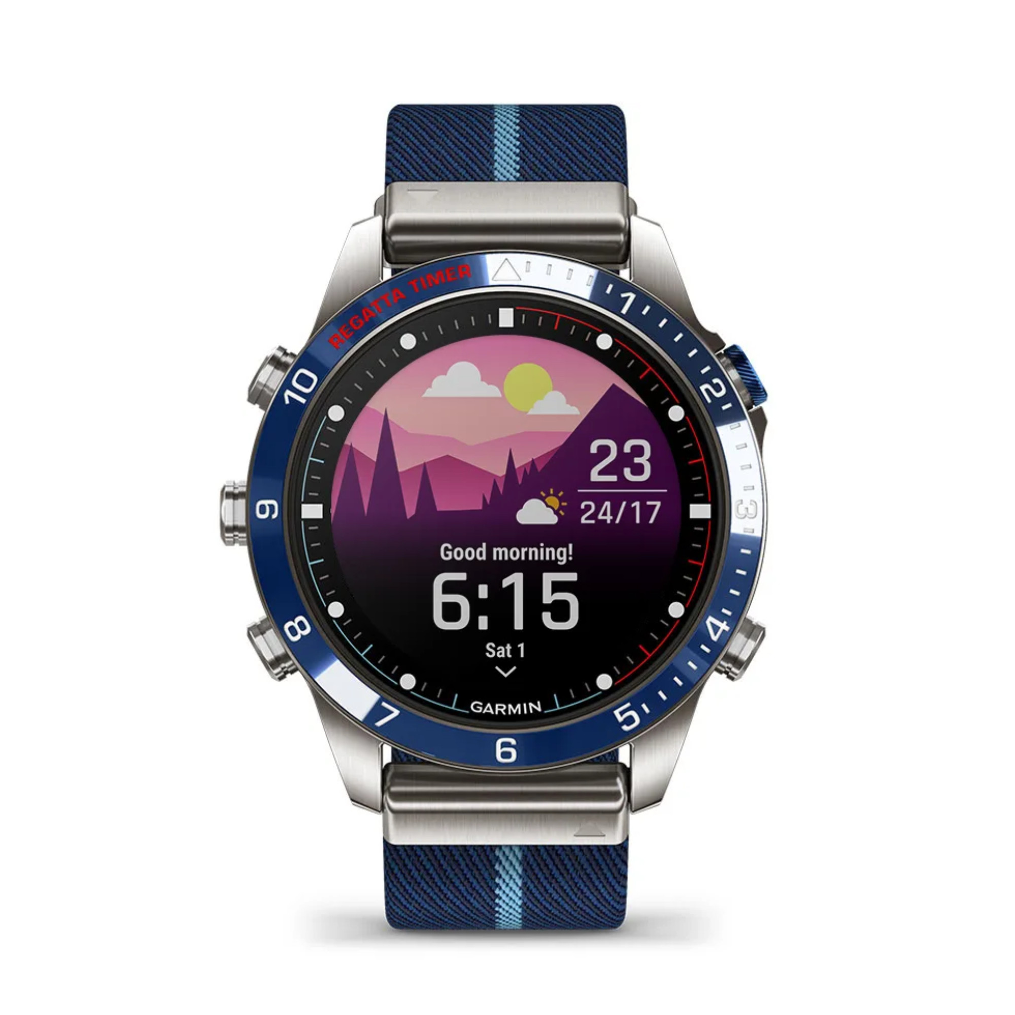La marque Garmin nous présente sa toute nouvelle Marq Gen 2 ! Un grand pas en avant niveau technologie a été opéré dans ce modèle Captain dont le passage du titane 2 au titane 5 et l'écran AMOLED de 1,2". La montre est livrée avec un bracelet en nylon tissé façon Jacquard et un bracelet bleu en silicone.