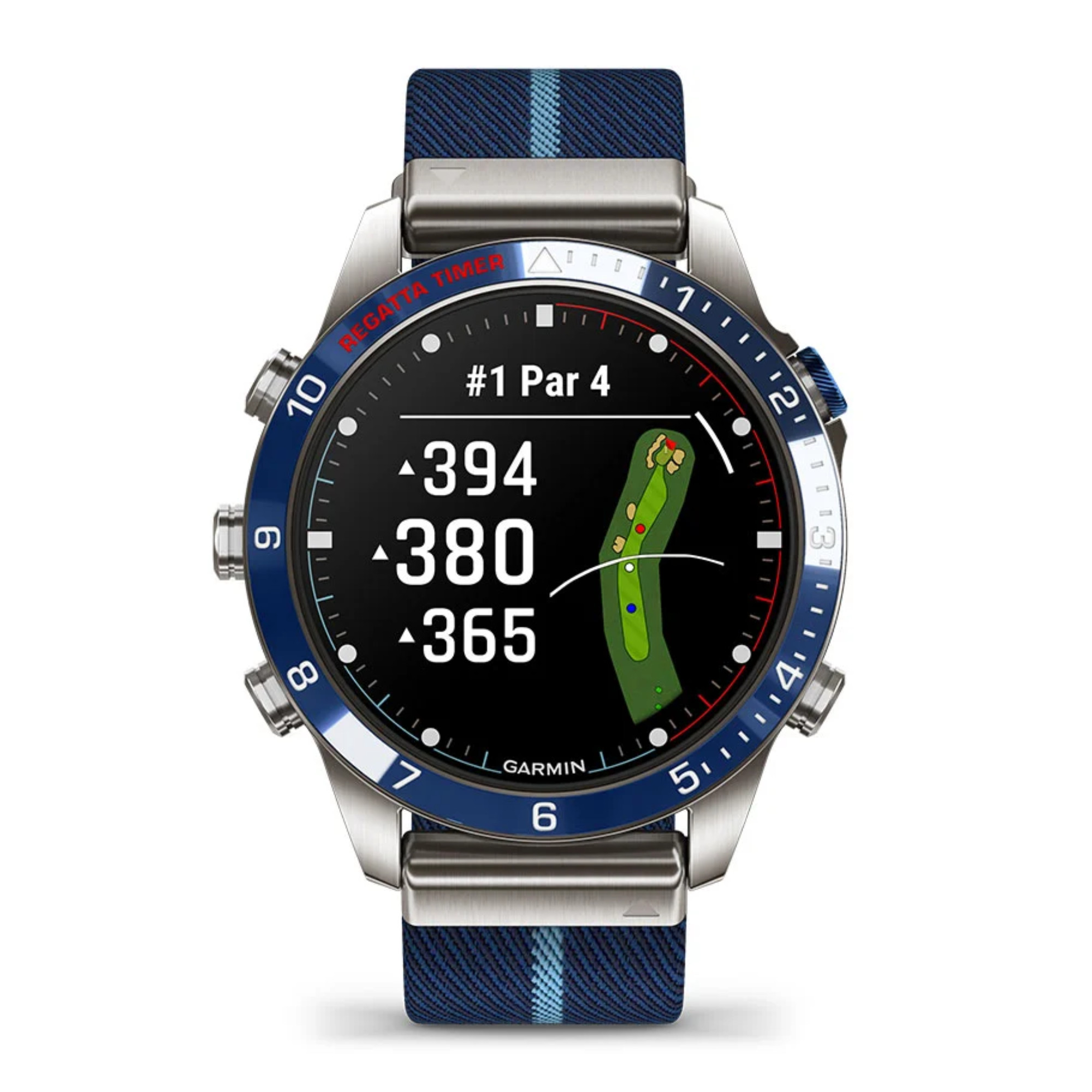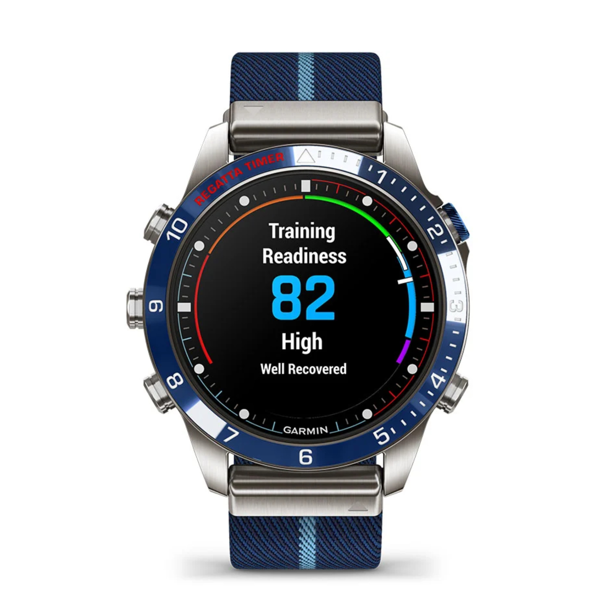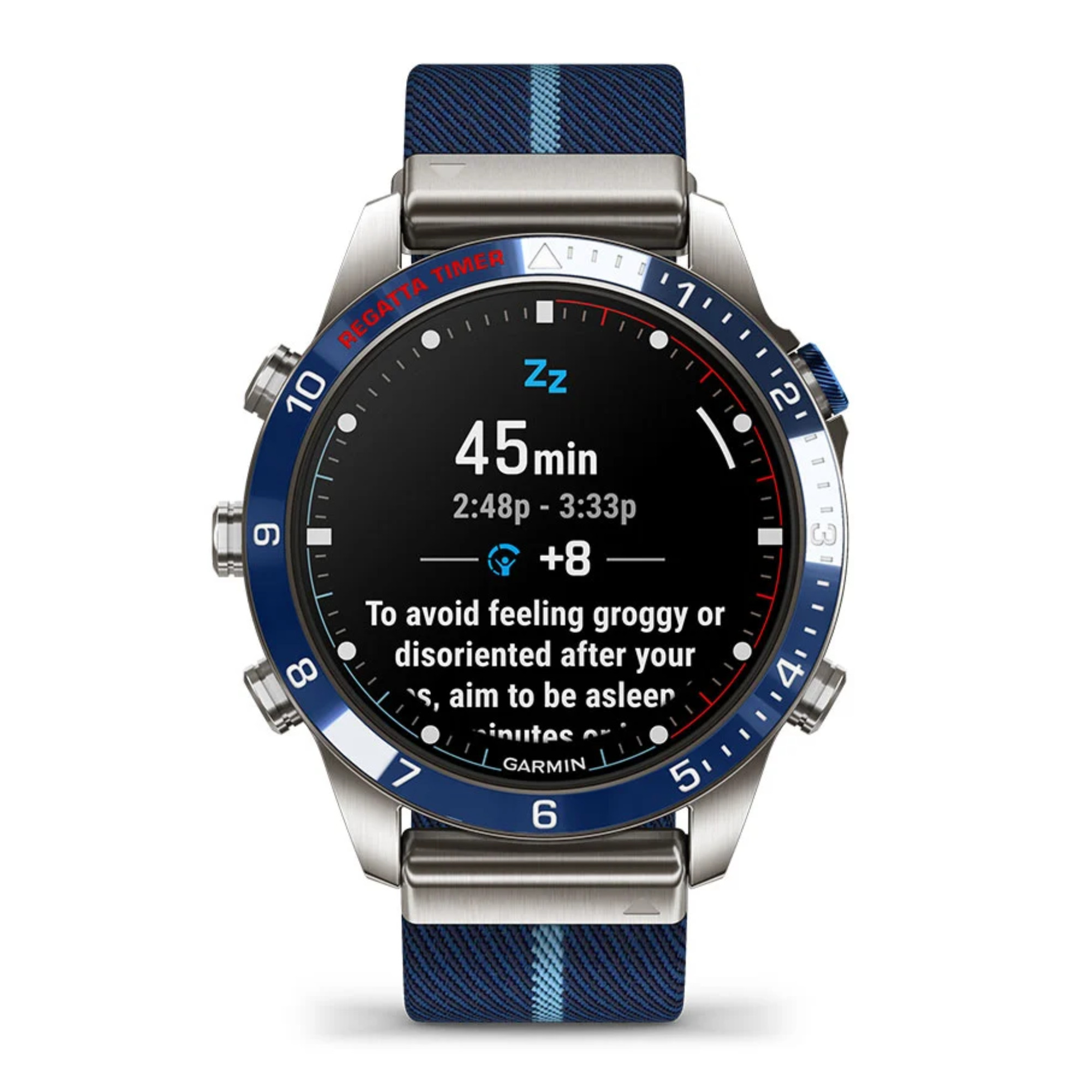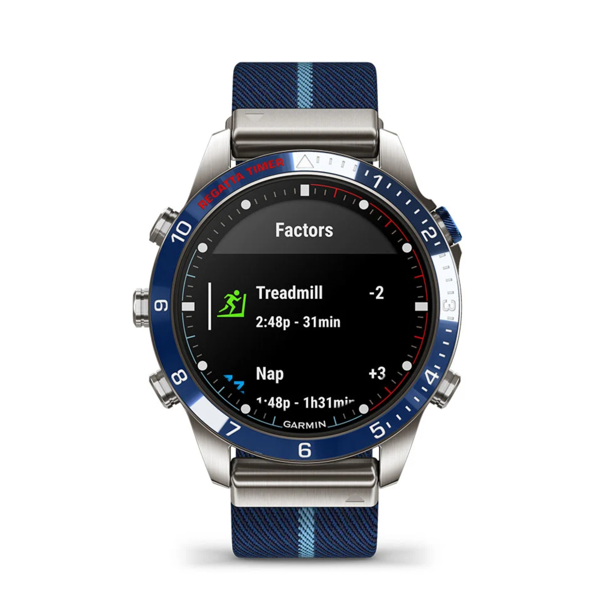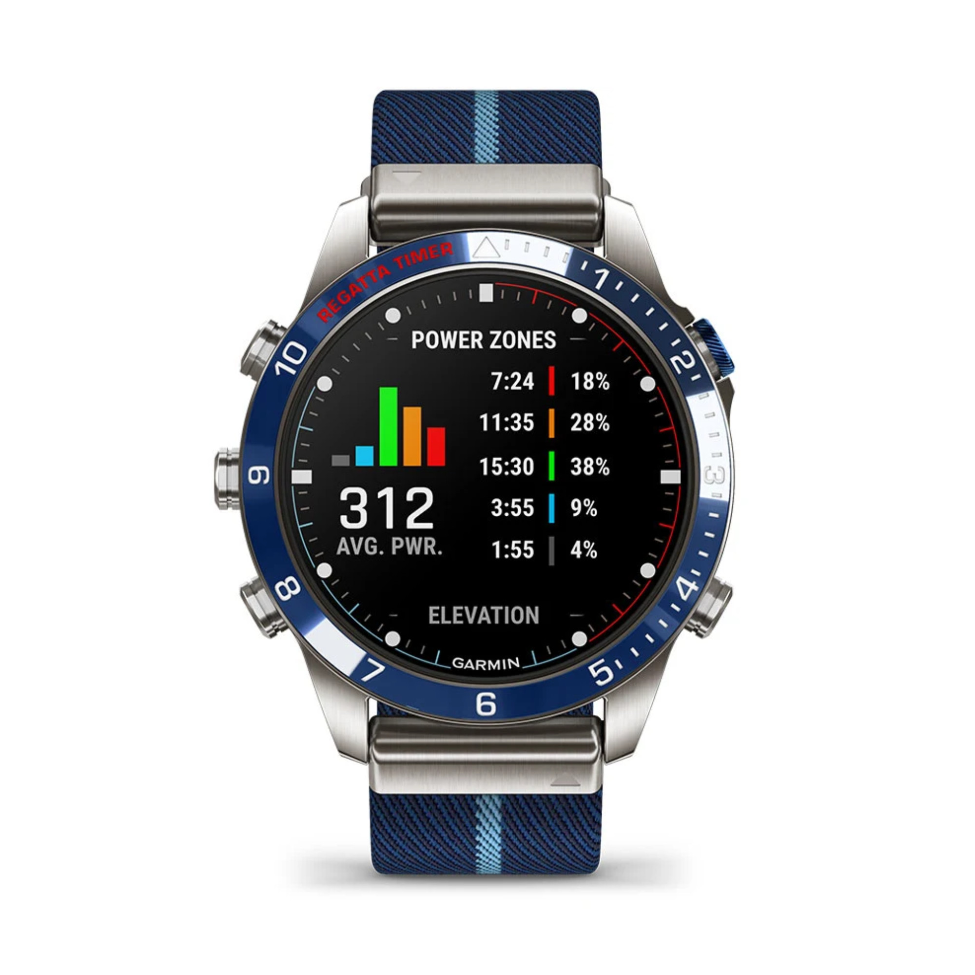 La marque Garmin nous présente sa toute nouvelle Marq Gen 2 ! Un grand pas en avant niveau technologie a été opéré dans ce modèle Captain dont le passage du titane 2 au titane 5 et l'écran AMOLED de 1,2". La montre est livrée avec un bracelet en nylon tissé façon Jacquard et un bracelet bleu en silicone.