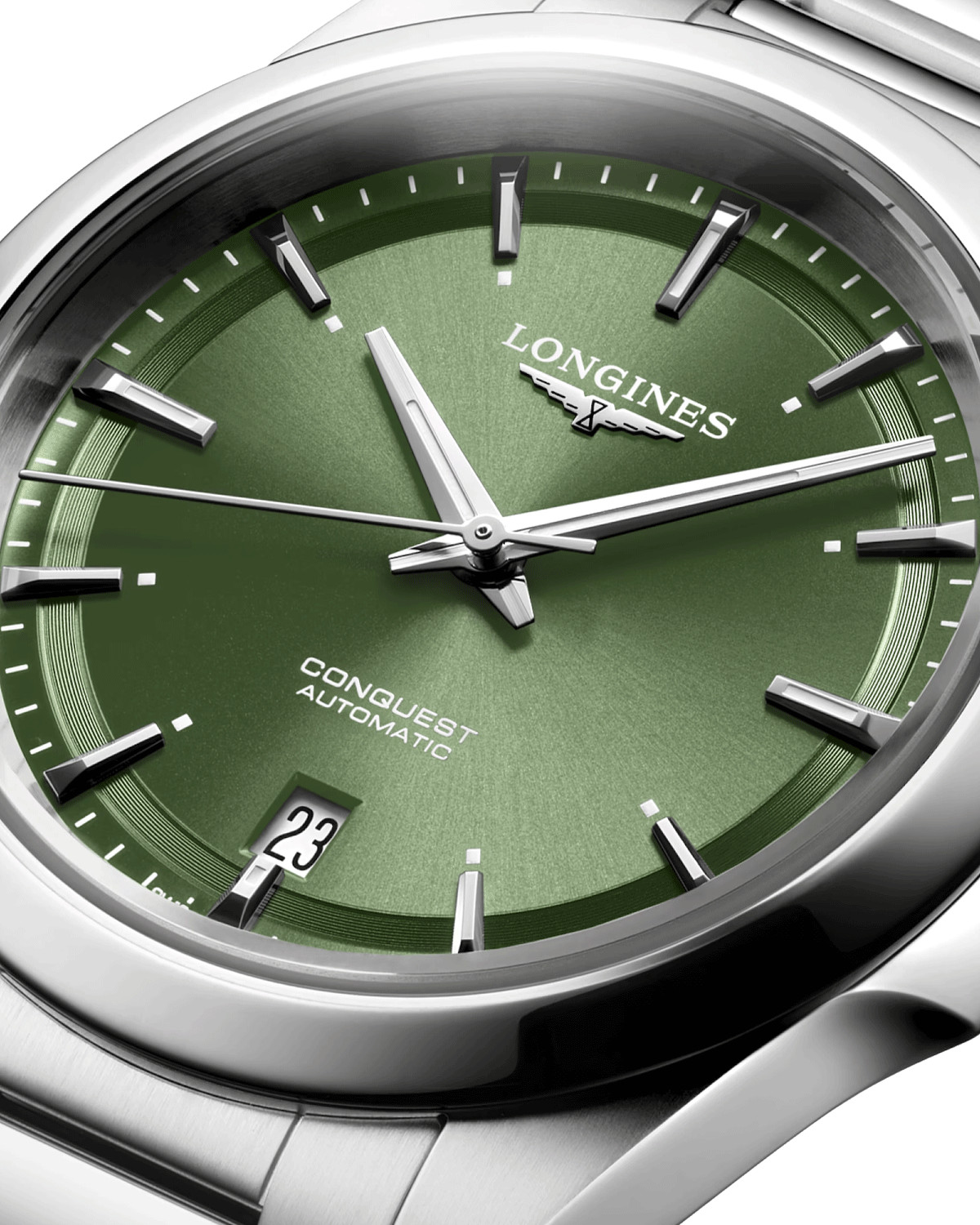 Avec son boîtier en acier poli, conférant à la montre à la fois robustesse et allure sophistiquée, la montre présente une taille idéale de 38 mm qui conviendra à tout type de poignet. Le cadran de cette Conquest est un véritable bijou visuel. Son fond vert soleillé met en valeur les index bâtons en applique, ainsi que les aiguilles dauphines, offrant une lisibilité optimale en toutes circonstances.