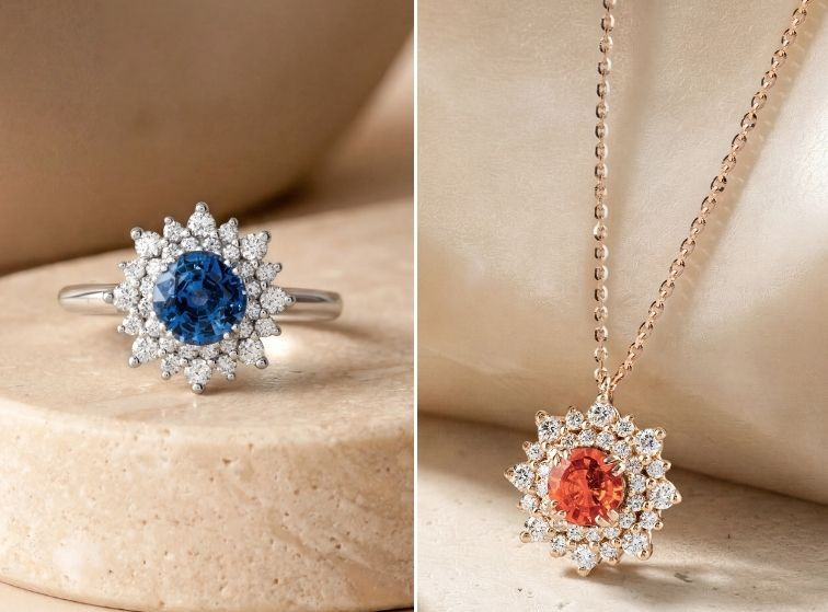 Les saphirs de couleur révèlent toute leur intensité au contact de l’or, chaque teinte trouvant un équilibre unique selon la monture choisie. L’or blanc souligne la pureté et la vivacité des nuances, tandis que l’or jaune réchauffe les pierres et en accentue la profondeur. L’or rose, quant à lui, apporte une douceur subtile, créant des associations délicates et contemporaines. De ces jeux de contrastes naissent des bijoux singuliers, où la couleur et la matière dialoguent avec justesse et élégance.