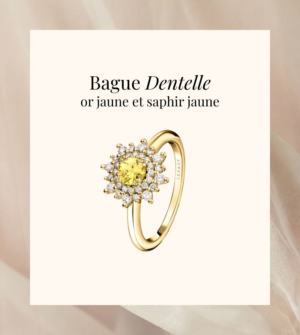 L’alliance de l’or jaune et du saphir jaune célèbre une lumière chaleureuse et enveloppante. Ton sur ton, la pierre et le métal se répondent avec évidence, créant un éclat solaire, à la fois doux et vibrant. Dans la bague Dentelle, cette harmonie se fait encore plus subtile : la finesse de l’entourage vient souligner la couleur sans jamais l’alourdir. Une pièce lumineuse, délicate, qui capte le regard tout en restant d’une élégance naturelle.